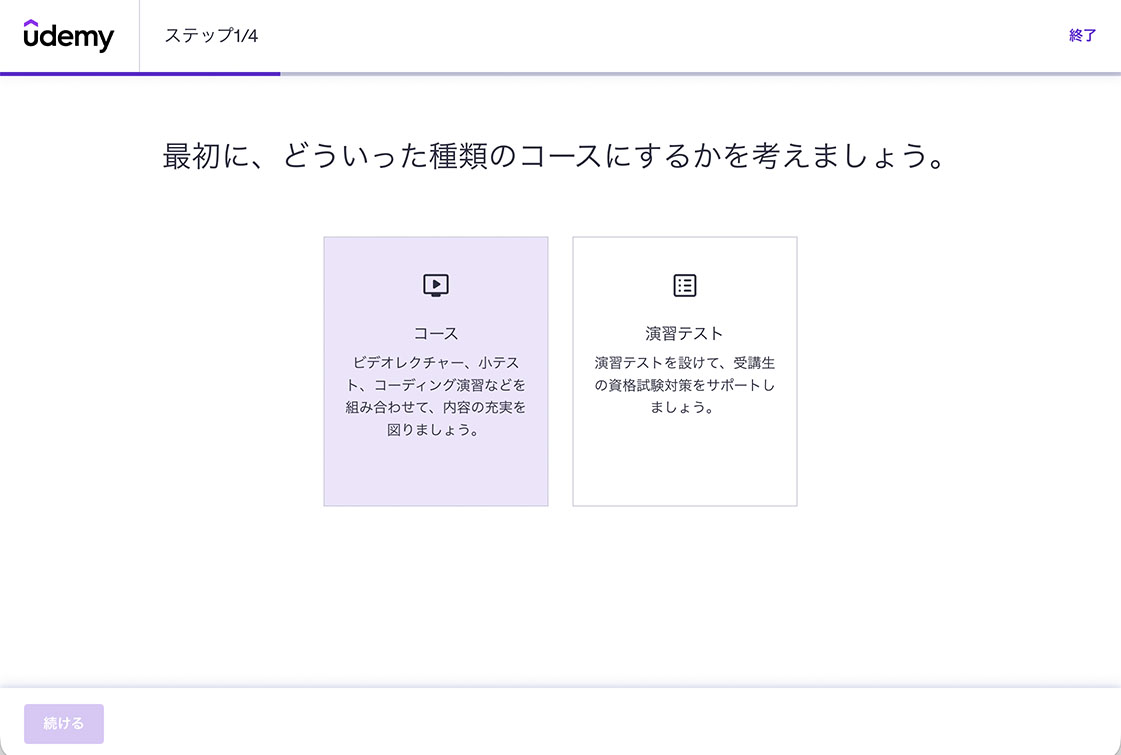 私の場合は「コース」を選択して「続ける」ボタンをクリックします。