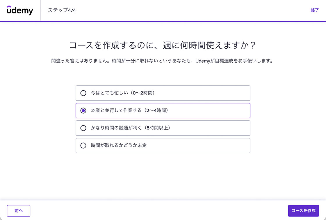 つぎにコースの作成に費やせる時間を選択する画面になります。