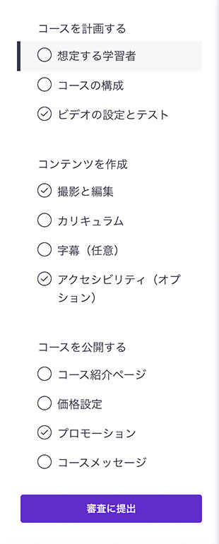 入力要件が満たされると各項目の丸にチェックがつきます。読むだけでよい項目があり、また「字幕(任意)」は任意なのでチェックなしでも大丈夫です。