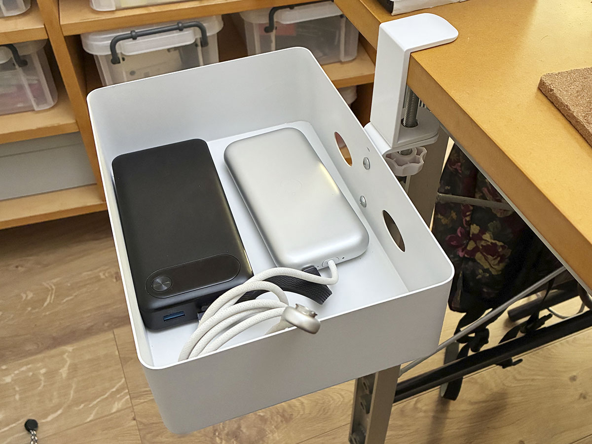 あまりによく使うので、購入してから早々に置き方を工夫して、デスクにテーブル下収納ラックを取り付けてます。